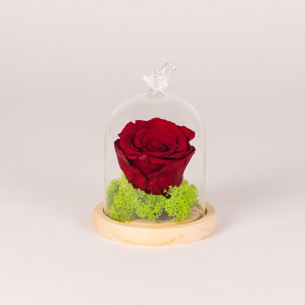 Clopot de sticla d10cm h14cm cu baza de lemn cu trandafir coservat rosu, muschi verde si cuib mic.