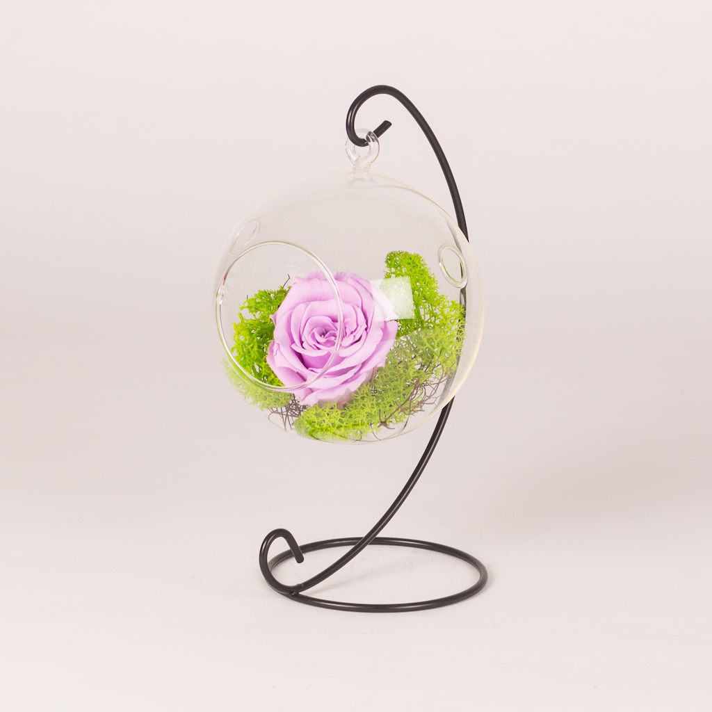 Dimensiunile terariului: diametru 12cm, inaltime totala cu suportul negru este de 22cm. Trandafir conservat roz si muschi