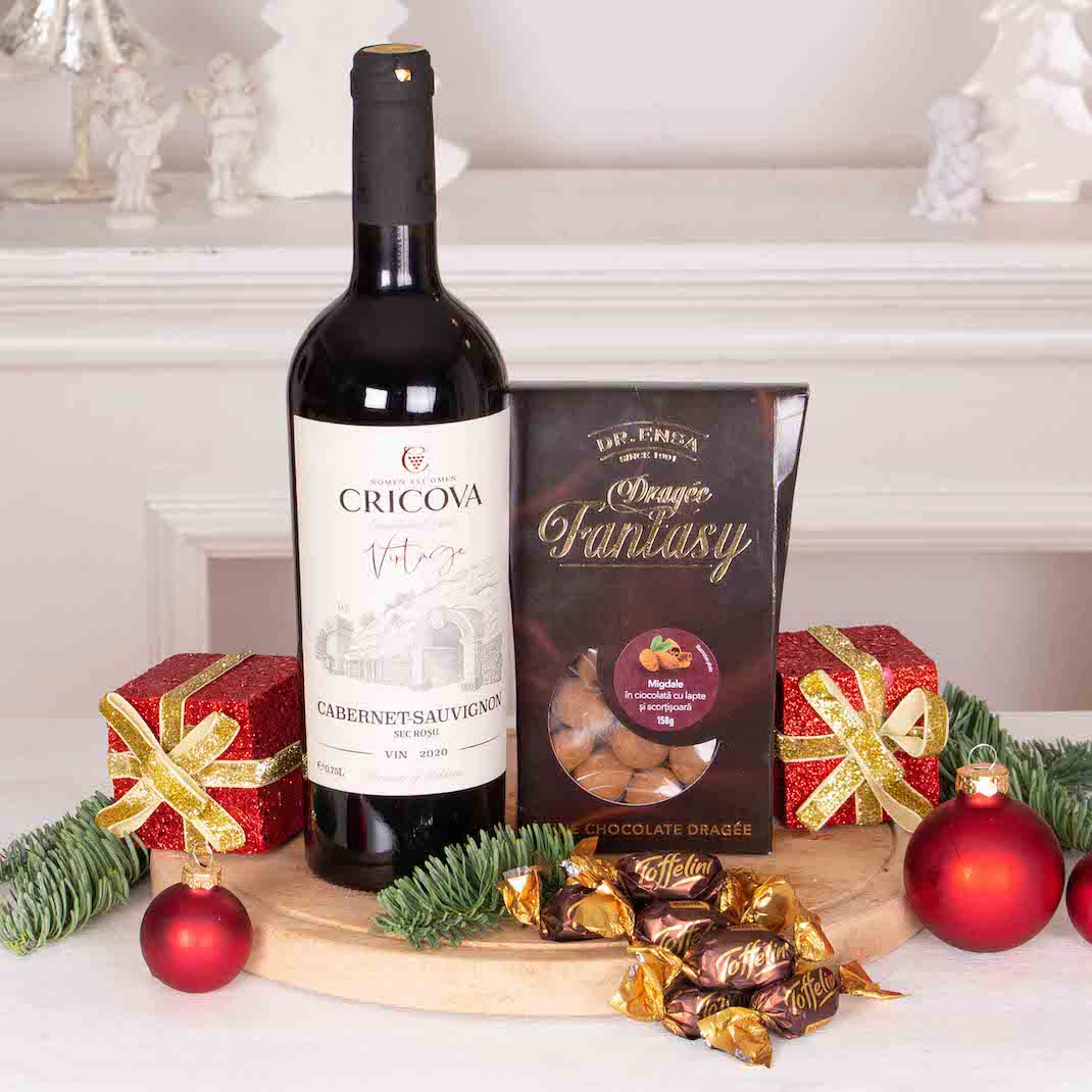 Cele mai speciale ocazii au nevoie de cadouri pe masura. Transforma o aniversare intr-o amintire frumoasa cu acest Cos cu Dulce si Vin Rosu . Cel mai frumos moment este acela in care ne oferim cadouri, in care daruim zambete celor dragi. Un cos cadou gourmet sau un cos cadou corporate este un fel simplu si frumos de a ne arata recunostinta, sau de a felicita pe cineva. Am ales produse de calitate, astfel incat apropiatii nostri, colegii sau partenerii de afaceri sa aiba parte de o surpriza frumoasa. Cozonac artizanal cu cacao si nuca sau mai bine, Cozonacul cu nuca insiropat cu vinars de la Braseria Zexe (bun de te lingi pe degete, la propriu!), Panettone Gran Ducale cu stafide , Chec artizanal cu ciocolata si portocale tot de la Braseria Zexe, paste delicioase si sosuri bine alese, Parmigiano Reggiano , turta dulce, praline de ciocolata, fursecuri apetisante cu unt si bineinteles, nu puteam sa nu stropim totul cu vinuri rafinate (Le Versant Cabernet Sauvignon, Wine Crime Rose, Cabernet Sauvignon Cricova Vintage Collection, Chardonnay Cricova Vintage Collection) dar si cu Prosecco si sampanie Moet. Adauga un mesaj personalizat si noi plecam de indata sa facem ceea ce stim noi mai bine, adica sa livram emotii.