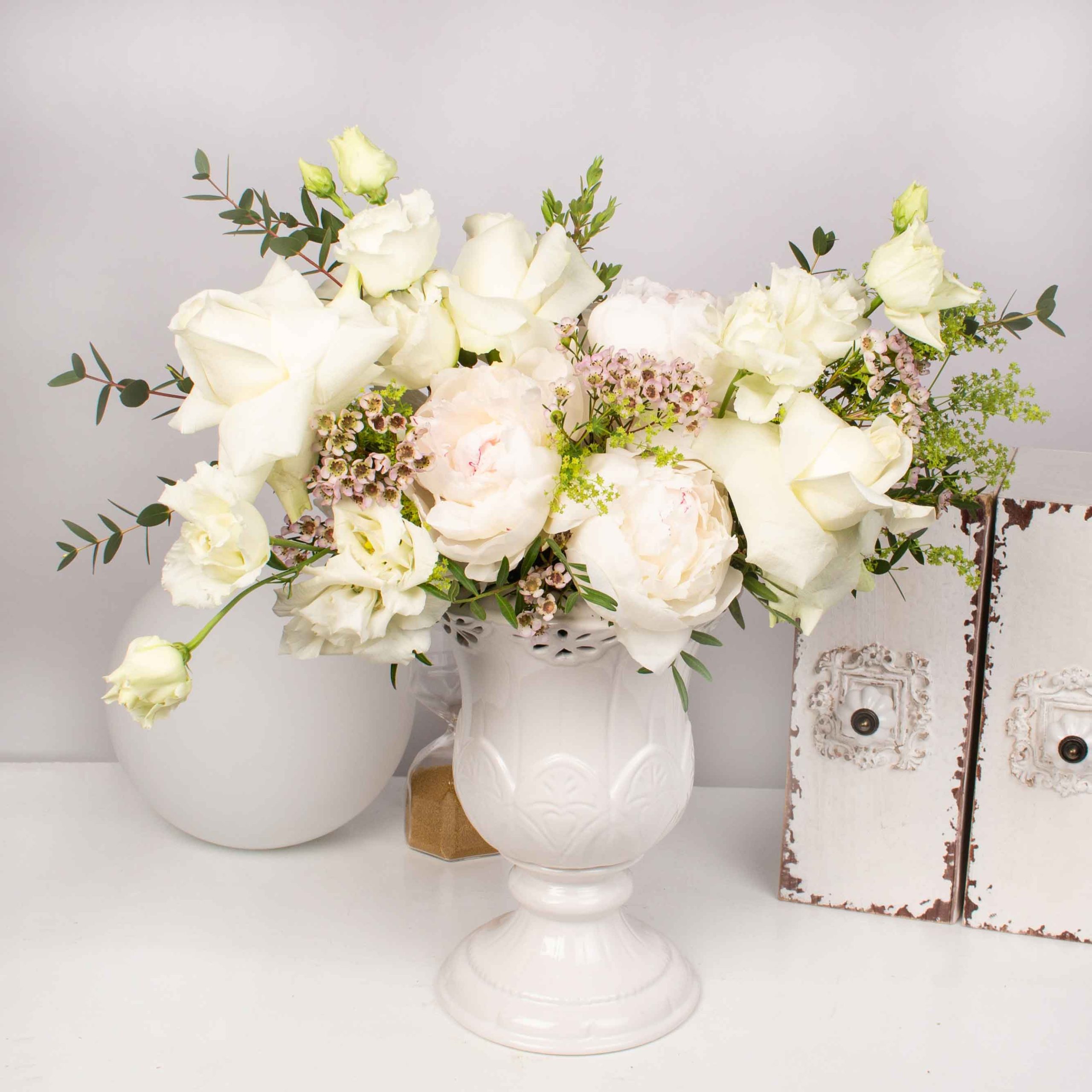 Urna de portelan cu 4 bujori albi, 3 trandafiri albi, 2 lisianthus alb, verdeata si alte flori de decor.