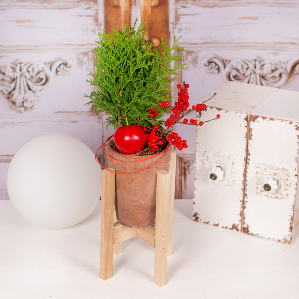 Aranjament in urna ceramica alba, 1 planta chamaecipris, ilex, mar cerat rosu si alte elemente de decor.