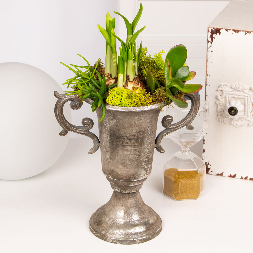 Primavara ne bucura privirea cu cele mai frumoase flori si cele mai expresive culori. Am strans in acest aranjament in urna cu bulbi de narcisa si suculente cele mai bune ganduri si cele mai sincere urari. Daruieste-l mai departe celor pe care ii indragesti si spune-le „O primavara frumoasa!” in cel mai frumos mod, prin flori pline de viata. Potrivit persoanelor deschise, comunicative si care apreciaza iesirile in natura, acest aranjament cu flori de sezon este cadoul potrivit pentru a le face sa zambeasca din plin.