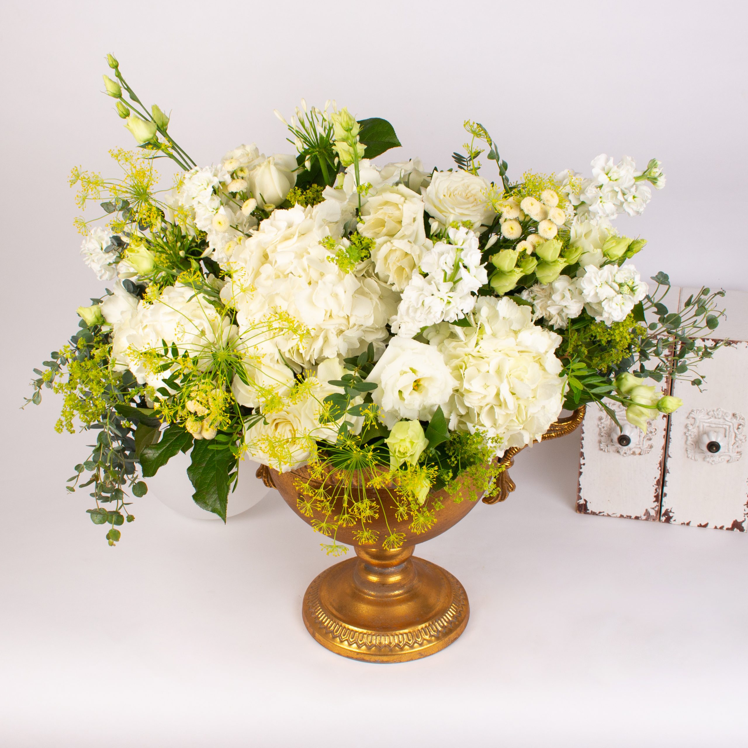 Aranjament cu 3 hortensie alba, 5 trandafiri albi, 3 lisianthus alb, 5 matthiola alba, verdeata si alte flori de decor, urna aurie.
