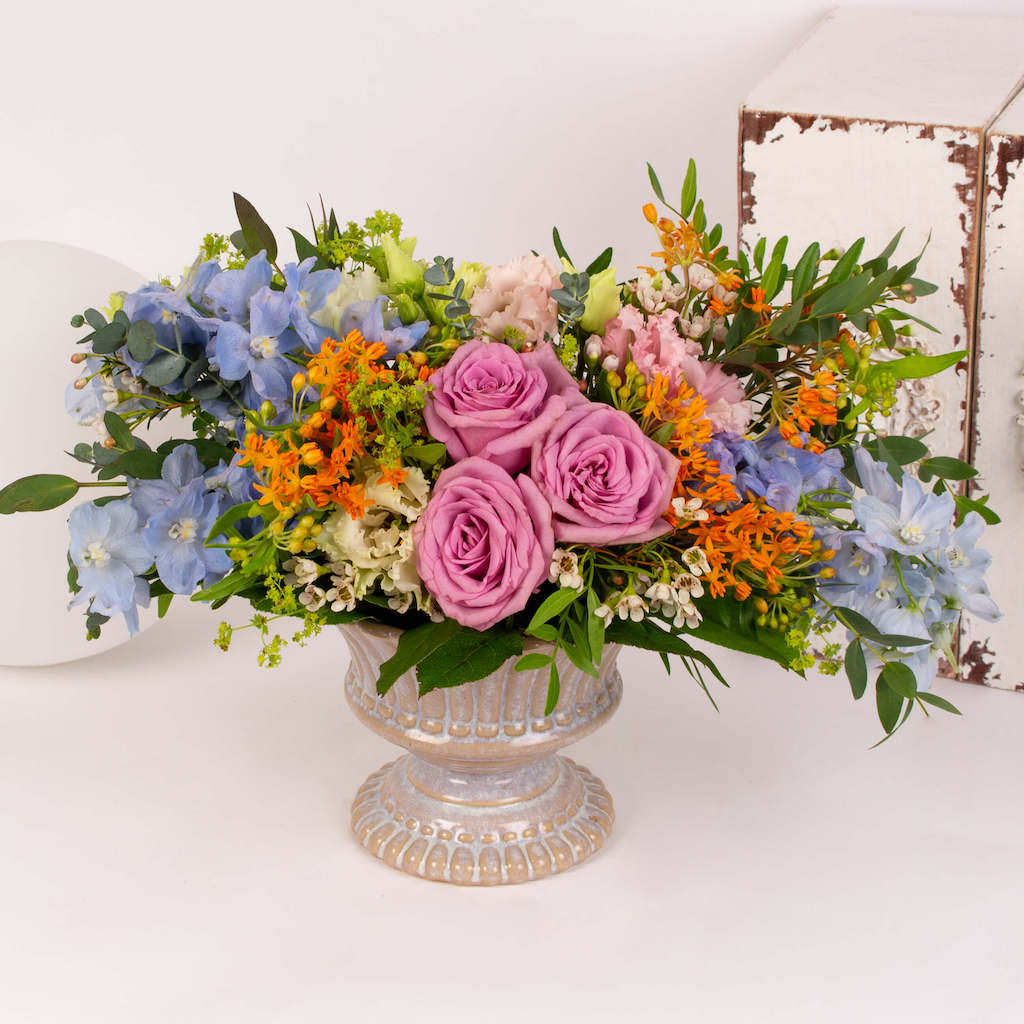 Iubim emotiile si bucuria pe care le vedem pe chipul celor care primesc flori si aranjamente florale pregatite in floraria Purple Flowers. De aceea ne straduim de fiecare data sa cream aranjamente unice care sa surprinda prin forma si culoare. Acest aranjament cu trandafiri, delphinium si alte flori este cadoul de care ai nevoie atunci cand vrei sa spui „Te iubesc!” unei persoane dragi.
