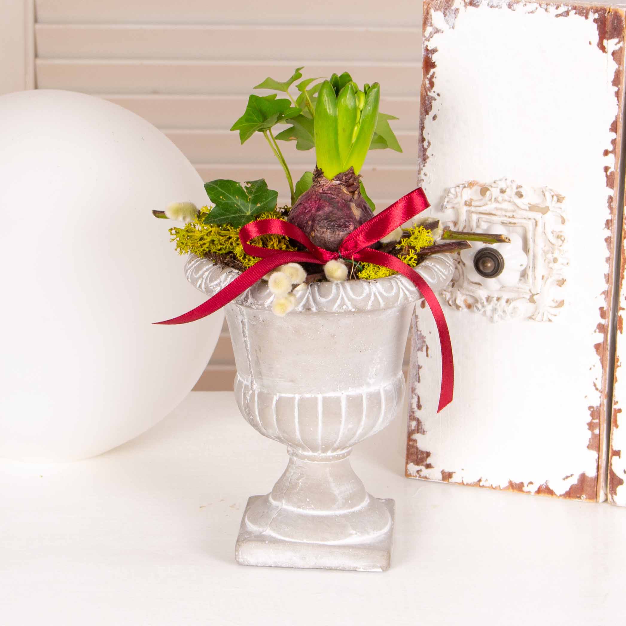 Aranjament in vas ceramic cu bulb de zambila, muschi verde, iedera, salix wilow.