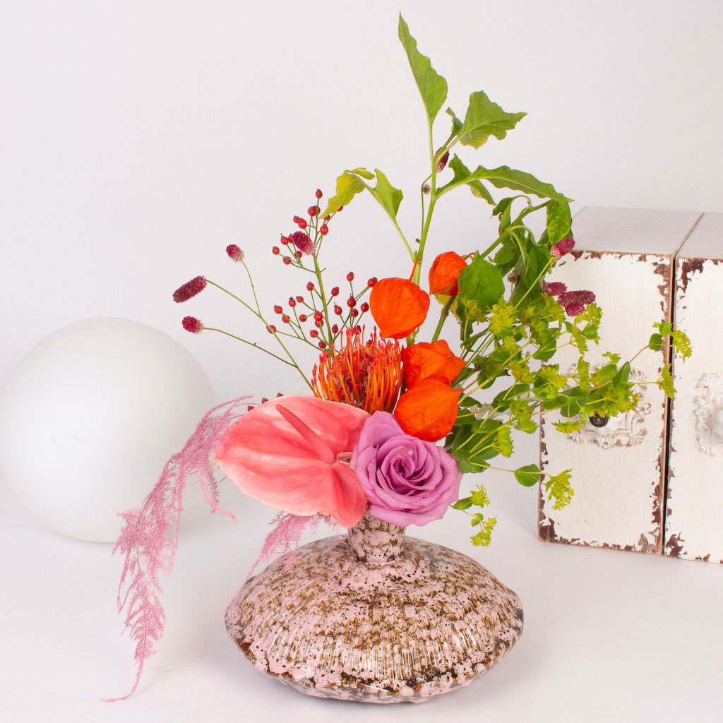 Aranjament in vaza roz cu protea, anthurium roz, trandafir, crenguta de macese, verdeata si alte flori de decor.